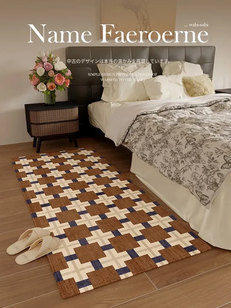 新作のベッドサイドカーペット|おしゃれな長方形デザイン|寝室や書斎に最適|ヴィンテージ風の茶色で、どんなインテリアにもマッチ|快適な足元を提供する高品質マット