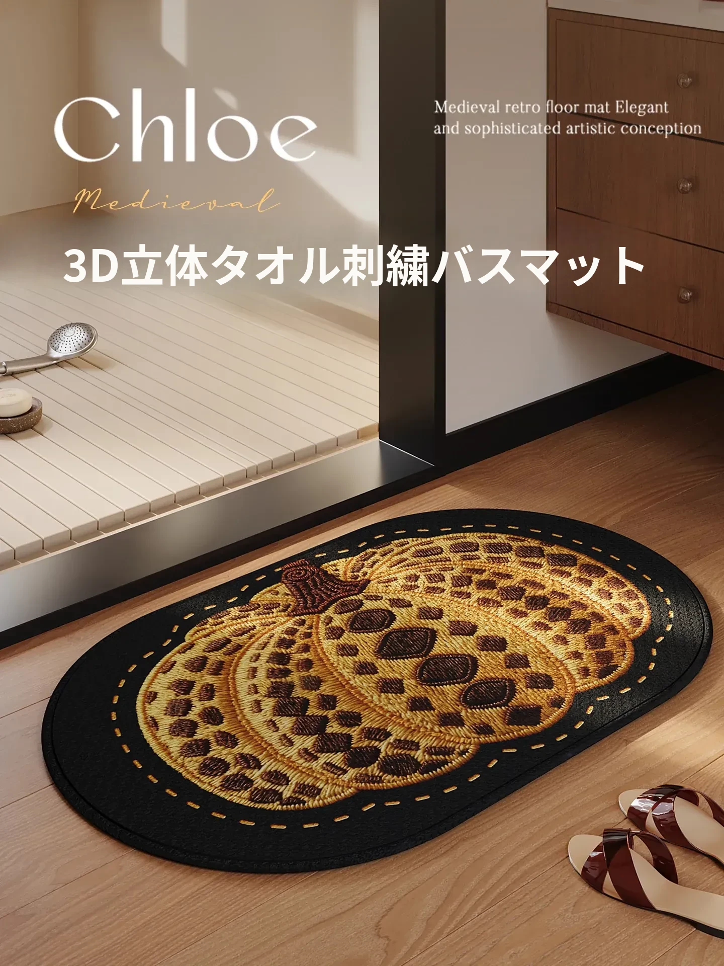 【立体毛糸刺繍】ファッショナブルな南瓜デザインのバスルームマット!吸水性抜群で滑り止め機能付き、トイレや洗面所に最適な衛生的なドアマットです。おしゃれで快適な空間を演出します!