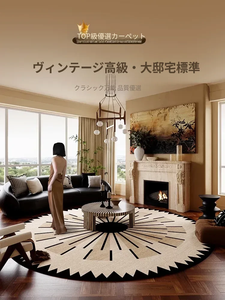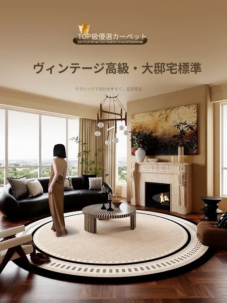フレンチスタイルの新作ラウンドカーペット - リビングルームや寝室にぴったりの高級感あふれるデザイン!お手入れ不要の便利さと、レトロなロッキングチェアやバルコニーにもマッチするスタイリッシュなインテリアアイテムです。
